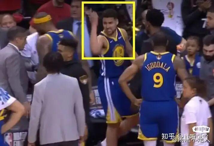汤普森总决赛第二场一次三分跳投下落过程中被被对手丹尼格林顶到腰部,导致克莱双脚不慎岔开造成大腿内侧拉伤(裁判连犯规都没吹)