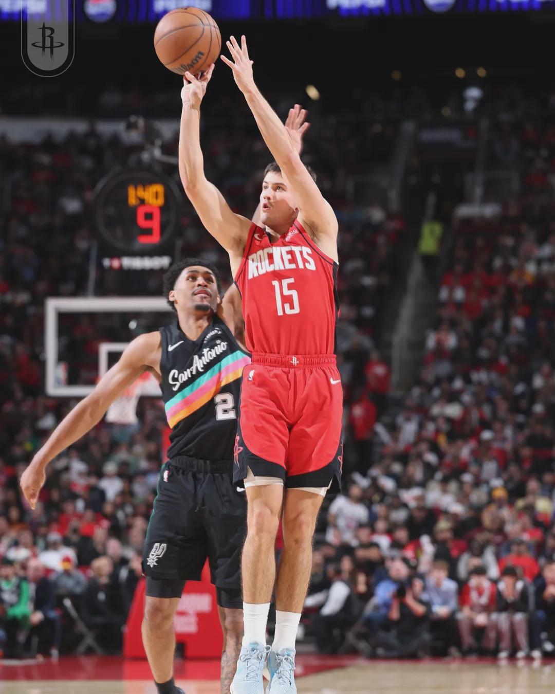 火箭本场首发:阿门-汤普森,奥科吉、杜兰特、小贾巴里-史密斯、申京。马刺首发:卡斯尔、福克斯、尚帕尼、巴恩斯、文班亚马。马刺第一节投疯了,全队三分球13中8,其中尚帕尼三分5中4。文班有点扎心,首节投篮3中0。